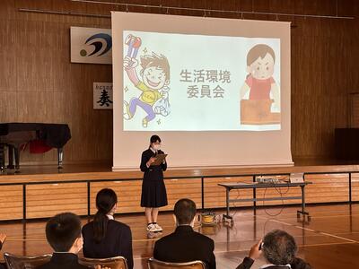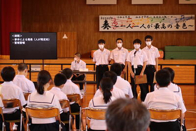 後半の部では、はじめに、生徒会長と副会長が自身の公約と取組を発表し、その後、各学年の代表が生徒会スローガン達成のために学年で考えた提案を発表しました。