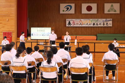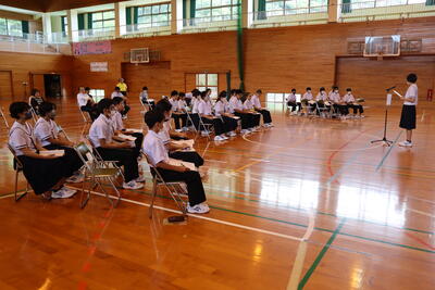 6月19日(水)に「天草郡市中体連選手推戴式」が行われました。各部活動のキャプテンが中体連での目標や意気込みを発表し、選手を代表して、女子ソフトテニス部主将の嶋村奈乃羽さんと野球部主将の吉田悠也くんが選手宣誓を行いました。また、生徒を代表して、辻藍さんが選手たちに激励の言葉を述べ、選手たちの士気を高めてくれました。