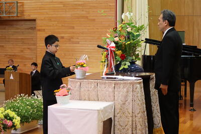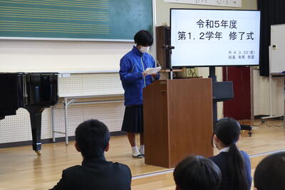 はじめに、校長先生より修了証授与を授与していただきました。その後、各学年の代表生徒が「1年間の振り返り」として、これまでの頑張りや今後の抱負等について、堂々と発表しました。最後には、音楽部の生徒がみんなのためにマンドリンを演奏してくれ、大盛り上がりをみせました。