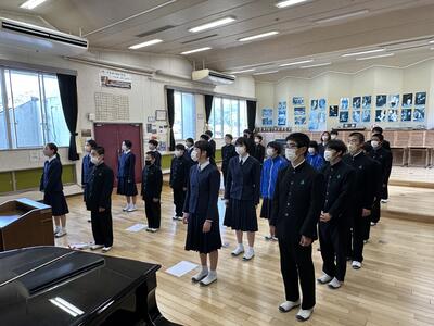 3月8日(金)に、在校生が見守る中、「3年生修了式」が行われました。全員で大きな声で返事をして起立し、代表生徒が修了証を受けとりました。
