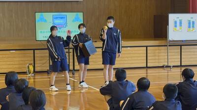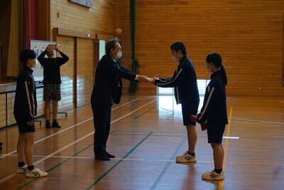 1年生は「職業調べ発表」で、調べてまとめたことをわかりやすく堂々と発表し、2年生は「立志式」で、保護者の方への思いを語って自分の誓いを宣言し、3年生は「親子レクリエーション」で、親子ペアで元気に楽しくバドミントンをしました。