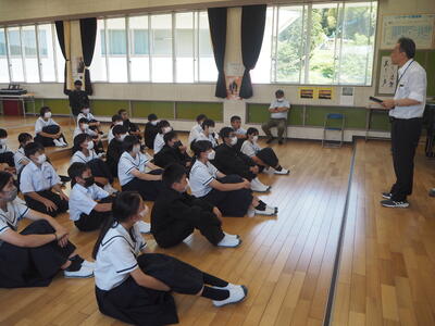 7月10日(月)に職業講話が行われました。今年度は、天草市議会議員の吉田修様と本戸馬場八幡宮宮司の宮﨑洸祐様をお招きし、仕事内容についてのお話や進路選択についてのアドバイス等を頂きました。生徒たちは、受験や就職等の近い将来の進路選択に向けて真剣に講話を聞き、積極的に質問したり、感想を述べたりしていました。