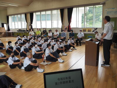 7月20日(木)に1学期終業式が行われ、各学年の代表者が「1学期の反省と夏休みの抱負」を発表しました。今学期は行事が盛りだくさんで大変だったと思いますが、学級や学校全体で協力しながら、互いに助け合いながら頑張ることができました。夏休みは、3年生は受験生として、しっかりと自分の進路と向き合いながら精一杯学習に取り組み、1・2年生は部活動に励みながら、課題にも計画的に取り組んでほしいと思います。また、駅伝大会に向けての練習も行われます。ここでもみんなで声を掛け合いながら頑張ってほしいです。