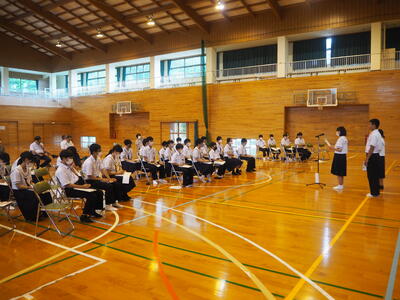 6月14日(水)に天草郡市中体連の選手推戴式を行いました。各部活動の主将が目標や意気込みを発表し、選手を代表してバスケ部主将の梅田未来さんと野球部主将の山形直哉くんが選手宣誓を行いました。また、蓑田希維さんが、選手たちに対して激励の言葉を述べました。17日からはじまる本番では、お世話になった方々への感謝の気持ちを忘れず、これまでの練習の成果を発揮できることを大いに期待しています。保護者の皆様も、あたたかいご声援をよろしくお願いいたします。
