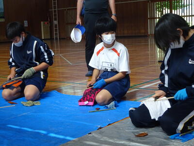 7月4日の総合的な学習の時間に、太鼓踊りのバチ作りに取り組みました。授業のはじめには、栖本町ふるさとづくりの会の松江様から、新しい笛も贈呈していただきました。栖本中生で、地域の伝統文化の継承のためにがんばっていきたいと思います。