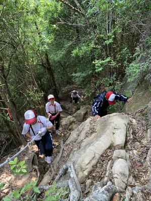 5月25日に、集団宿泊教室の日程を縮めて、1日体験学習が行われました。ナイフを使っての竹箸作りや、次郎丸嶽登山を体験しました。快晴のもと、慣れない山道、岩をよじ登るようなきつい上り坂に苦労しつつ、みんなで励まし合って、頂上にたどり着くことができました。山頂の素晴らしい景色を堪能しながらのお弁当は最高の体験でした。