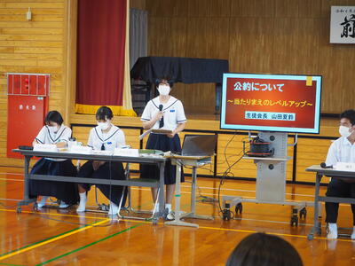6月3日に生徒総会が行われました。事前に学級や委員会で話し合いを行い、当日は各委員会への質問・要望、各学年の提案発表を行いました。出された意見に対して、話し合いながら一つにまとめていく姿に、多くの学びと成長が見られた生徒総会でした。