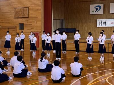9月13日に天草郡市中体連陸上の選手推戴式を行いました。明後日の大会に本校から22名の生徒が選手として出場します。