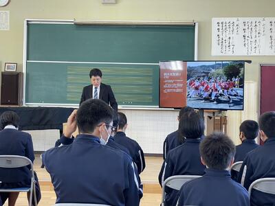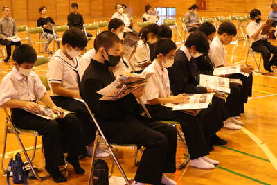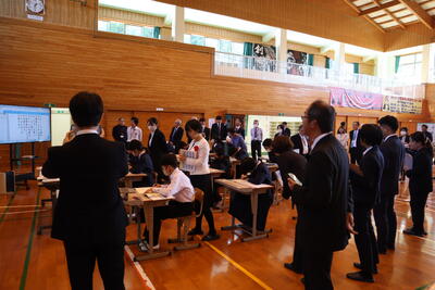 10月31日(木)に「高校説明会」がありました。今年度は、天草拓心高校(本渡校舎・マリン校舎)、天草工業高校、天草高校倉岳校、天草高校の4校の先生方にお越し頂き、各学校の特色や魅力等について全校生徒にお話をして頂きました。