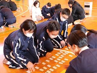 百人一首大会(R4.3.3) 投稿日時 : 2022/03/10 学校サイト管理者 新型コロナウイルス感染防止に配慮して、1月から延期になっていた百人一首大会を3月3日に実施しました。受検を終えてひと安心した3年生も思い切り楽しみ、卒業前のいい思い出作りになりました。