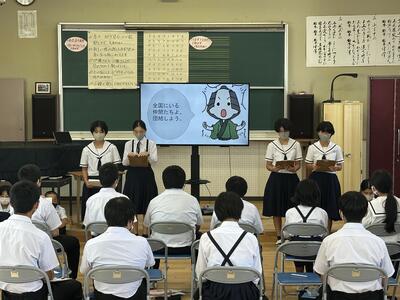 10月11日(金)に「校内人権集会」が実施されました。はじめに、SST(ソーシャルスキルトレーニング)のガイダンスを行い、その後学年ごとの発表、発表に対する返しの時間、という流れでした。
