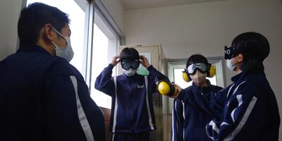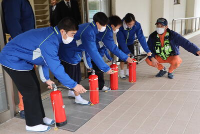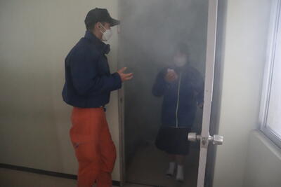 授業中の火災発生および避難を想定し、訓練を行いました。講評を頂き、学校や施設等での避難経路の探し方を教えて頂いた後、消火・煙体験も行いました。生徒たちは、学校だけでなくいろいろな場所における避難経路の探し方、消火器の使い方、煙の怖さと避難姿勢等について知ることができました。また、教職員にとっても、防災計画を見直すきっかけとなり、改めて防災意識を高めることができました。