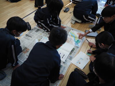 気象に関する基礎知識や情報についてのレクチャーを受けたのち、班ごとに架空の町で様々な条件のもと、災害に向けての対策を考えました。また、「くまもとマイタイムライン」を用いて、自宅周辺のハザードマップと照らし合わせながら、避難の準備や避難行動についての計画を立てていました。