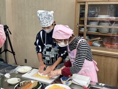 12月13日(水)に3年生が調理実習を行いました。今回は「栖本ソウルフード学習会」と題して、社会福祉協議会栖本支所の方々のご支援・ご協力のもと、食生活改善推進員さんにご指導いただき、薄焼き卵で巻いた「手巻き寿司」をつくりました。