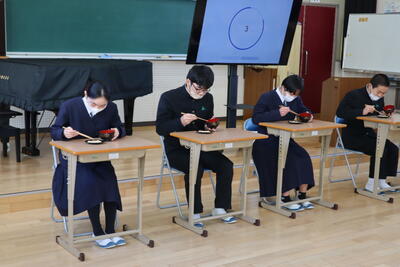 はじめは「お箸でお豆運び大会」が縦割り班対抗で行われました。練習ではできていたのに、緊張のせいかなかなか思うようにお豆をつかめず苦戦する姿も…。ちょっとしたハプニングもあり大盛り上がりでした。