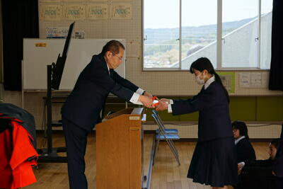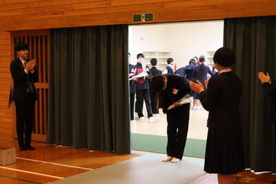 3月6日(金)に、在校生が見守る中、「3年生修了式」が行われました。全員で大きな声で返事をして起立し、代表生徒が修了証を受けとりました。