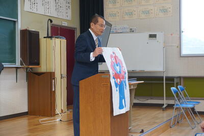 2学期の総合で1年生が考えたキャラクターを、すもと史跡ウォークのイラスト募集に応募しました。そして見事採用されることになり、キーホルダーを作っていただけることとなりました。そして1月19日(火)に栖本地区振興会 会長 倉田さんと、河内コミュニティーセンターの倉田さんから素敵なキーホルダーを贈呈していただきました。