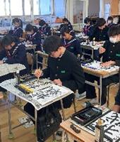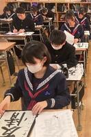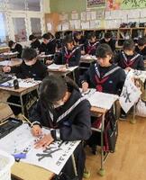 1月9日(金)5・6校時に、校内席書大会を行いました。課題は、1年「友情」・2年「信念」・3年「挑戦」でした。3学年とも、しゃべる人がいなく、静かな中で一生懸命頑張っていました。静かな中で、黙々と頑張る姿がとても印象的でした。
