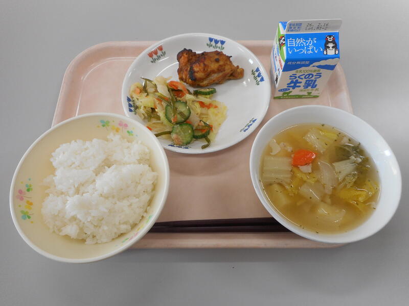 今日の給食のメニューは、【牛乳、白ごはん、野菜スープ、タンドリーチキン、茎わかめの酢の物】です。今日は、“タンドリーチキン” が何と言っても紹介せずにはいられません。香ばしい焼き具合と、ジューシーな肉質がたまらなく美味しかったです。また、“茎わかめの酢の物” は、茎わかめの食感がすばらしく、これまたたいへん美味しかったです。今日から2月です。明日は節分で、暦の上ではいよいよ春がやってきます。何だか、心まで温かくなってきます。