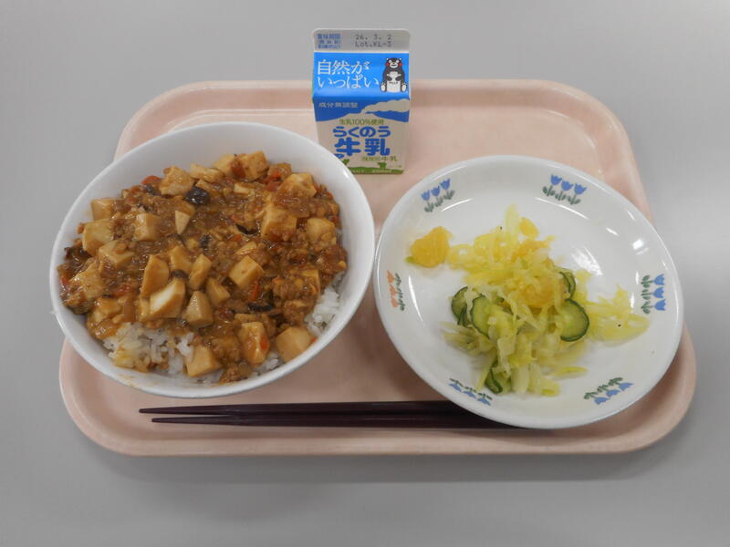 今日の給食のメニューは、【牛乳、マーボー豆腐丼、甘夏サラダ】です。マーボー豆腐とごはんが別々に配膳されることが多い中で、最初から “マーボー丼” として登場しました。味は抜群においしく、また、ボリュームもあって大満足です。別々に配膳されると、ごはんにマーボー豆腐をかけて食べることに若干、不安にかられることがある中で、最初から丼物として登場し、嬉しい限りです。また、“甘夏サラダ” は、甘夏の酸味がほどよく野菜となじんでこれまた美味しかったです。今日もありがとうございました。