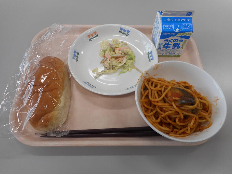 今日の給食のメニューは、【牛乳・ミルクパン・なすとトマトのスパゲティ・カミカミごぼうサラダ】です。