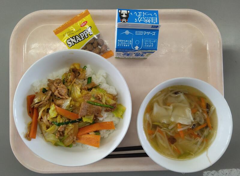 今日の給食のメニューは、【牛乳・スタミナ丼・ワンタンスープ・黒糖ビーンズ】です。