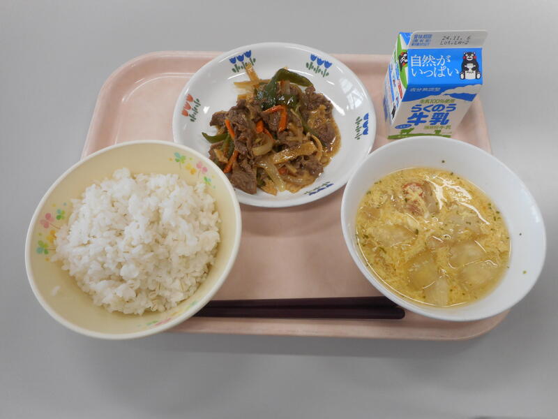 本日の給食のメニューは、【牛乳・麦ごはん・トマトと卵のスープ・チンジャオロースー】です。和牛給食ということで、チンジャオロースーには和牛が使われていました。和牛というだけあり、やっぱりおいしいですね。先週の金曜日から出張等が続き、給食が食べられていませんでしたが、温かく・旬のものも食べられてやはり給食はいいですね。