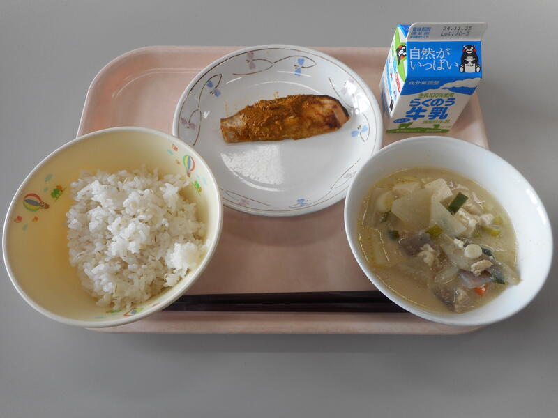 今日の給食のメニューは、【牛乳・麦ごはん・豆乳入り豚汁・タンドリーサーモン】です。今日は11月11日と1がずらっと並んでいます。例年であれば、寒い時期のはずですが、今日は朝から暖かく、時間とともに日差しも出てきて、過ごしやすい一日となっています。さて、“豆乳入り豚汁” ですが、豚肉・豆腐・にんじんなど多くの具材が使われています。そして、名前にもあるように “豆乳” も入っています。栄養抜群で食べているだけで元気が出てきそうです。また、 “タンドリーサーモン” はおしゃれで、味よしと抜群においしかったです。寒くなってくる時期ですので、こういうメニューはとても嬉しいですね。