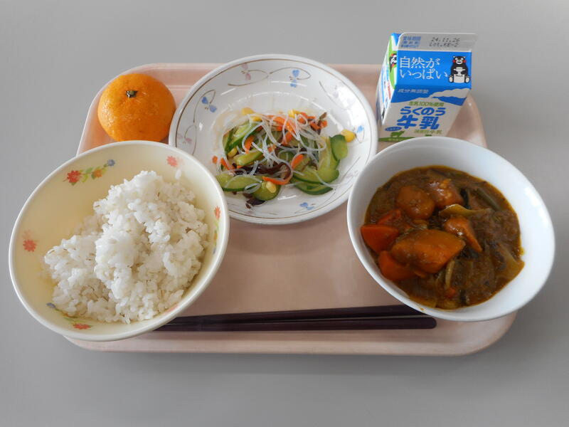 1学期最後の給食のメニューは、【牛乳・チキンカレーライス・アーモンドサラダ】です。明日12日(土)~16日(水)まで3連休+秋休みとなります。そして、2学期が始まってすぐの18日(金)は阿蘇郡市の駅伝大会となります。ということで、本日は【1学期ラスト】及び【駅伝応援メニュー】となっています。