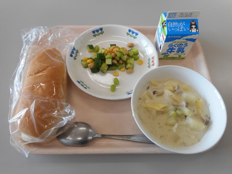 今日の給食のメニューは、【牛乳・ミルクパン・コーンクリームシチュー・フルーツのジュレ和え】です。本日のメニューは、リクエストメニュー第6位となっています。地域によっては、パン食が週2回となっているところもありますが、高森町では原則木曜日がパン食で、本日は “ミルクパン” でした。通常のコッペパンと比べてほんのり甘さがあり人気のあるパンです。また、“コーンクリームシチュー” は、コーンもたくさん入っていて美味しかったです。そして、 “フルーツのジュレ和え” は、いうまでもなく絶品でした。今日もとても美味しい給食でした。