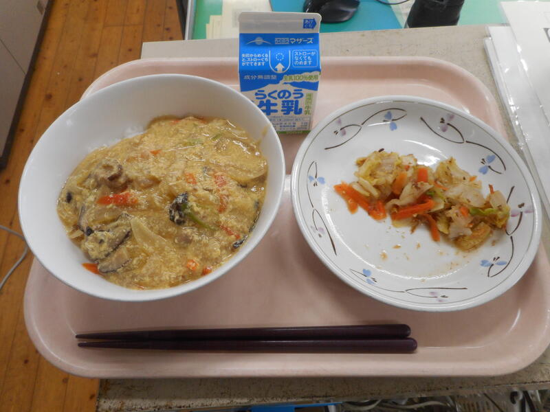 今日の給食のメニューは、【牛乳・麦ごはん・高野豆腐の卵とじ・酢みあえ】です。高野豆腐は私が大好きな食材です。小さい頃、高野豆腐が食事に出たとき、高野豆腐に汁を吸わせチューチュー吸って食べていたところ、母親から叱られたことを思い出します。