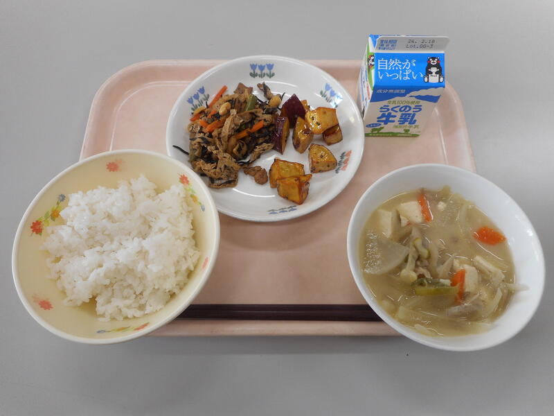 今日の給食のメニューは、【牛乳、セルフひじきごはん、豚汁、大学芋】です。ひじきは単体でも美味しいのですが、今日は “セルフひじきごはん” ということで、ご飯にのせて・混ぜていただきました。こういう食べ方をすると、食も進み、また、味もよく美味しかったです。また、“大学芋” は、さつまいもの甘みと水飴の甘さのコラボが最高に美味しかったです。ただ、最近こういうものをいただくときは、歯を大事にしたく、ゆっくりと食べることを心がけています。とっても美味しい給食でした。