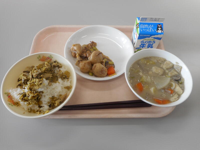 今日の給食のメニューは、【牛乳、セルフ豚高菜ごはん、だんご汁、里芋のそぼろ煮】です。今週から3年生の入試が本格的に始まっていきます。3年生のみなさんは、これまでの頑張りを十二分に発揮するためにも、食事・睡眠等をしっかりとり、万全の状態で試験に向かってほしいと思います。