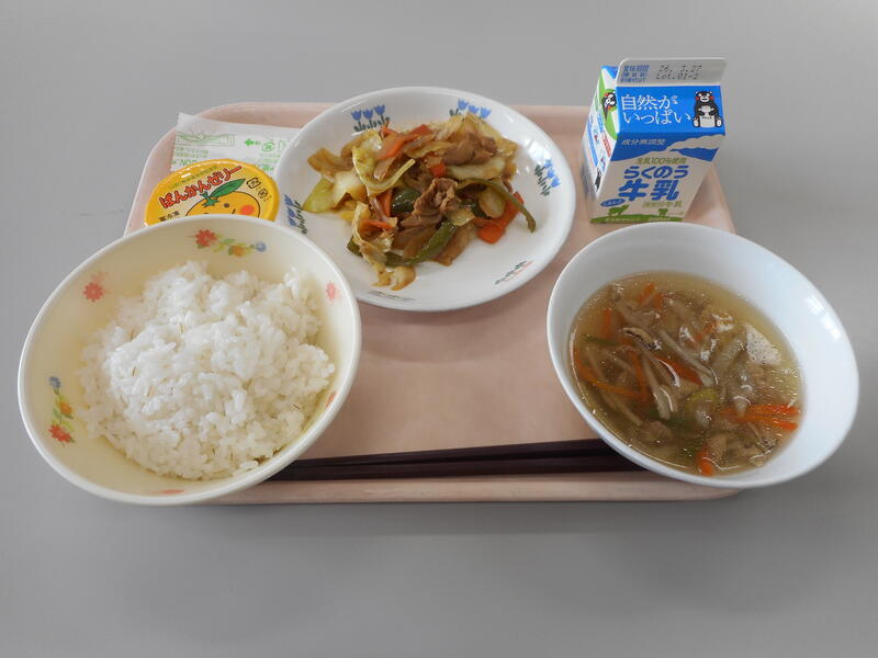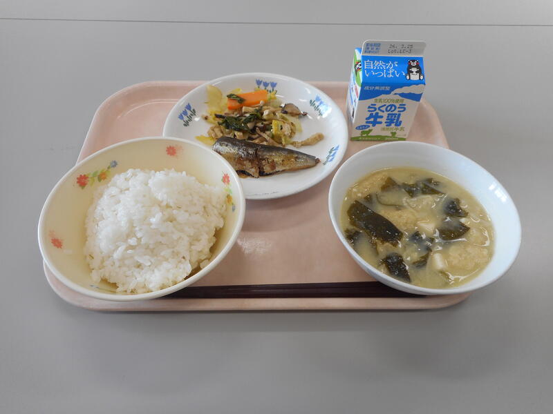 今日の給食のメニューは、【牛乳、白ごはん、豆腐のみそ汁、いわしのしょうが煮、菜焼き】です。私もメニュー表を見ながら、“菜焼き” ? とすぐに料理のイメージが出てこなかったのですが、菜焼きは主に熊本県阿蘇地方の郷土料理で、高菜漬け、白菜、小松菜などの青菜を油揚げとともに油で炒め、醤油や砂糖で味付けしたものです。阿蘇で働いていながらお恥ずかしい限りです。“いわしのしょうが煮” とともにご飯のおかずにぴったりでとても美味しかったです。また、“豆腐のみそ汁” と言えば、みそ汁の王道です。大好きなみそ汁で、これぞ、“ザ! 和食” といったメニューに大満足でした。