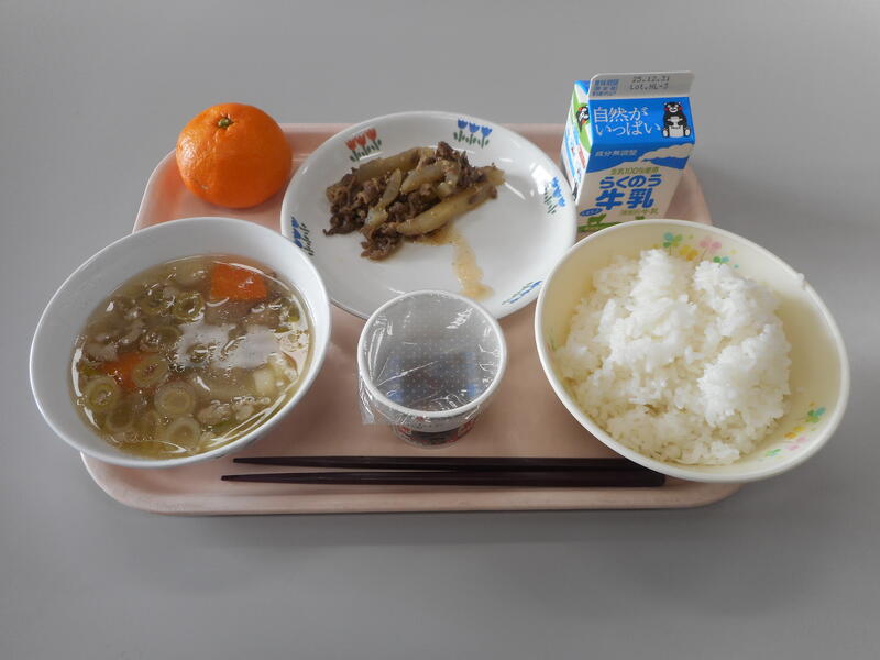 今日の給食のメニューは、【牛乳・麦ごはん・武光公鍋・牛肉とヤーコンのきんぴら・納豆・みかん】です。やはり今日のメニューで目を引くのが、“武光公鍋” ではないでしょうか。初めてではないと思いますが、熊本県ではわりと馴染みのあるメニューです。諸説ありますが、熊本県菊池地方に伝わる郷土料理で、南北朝時代の武将・菊池武光が考案したとされる、鴨肉(給食などでは鶏肉で代用)や野菜、平たいうどん(ひら麺)などを煮込んだ温まる鍋料理です。給食では、肥後だんごが使われていました。とても美味しかったです。また、“牛肉とヤーコンのきんぴら” もヤーコンの食感もよく、牛肉の美味しさと相まって最高でした。今日もありがとうございました。