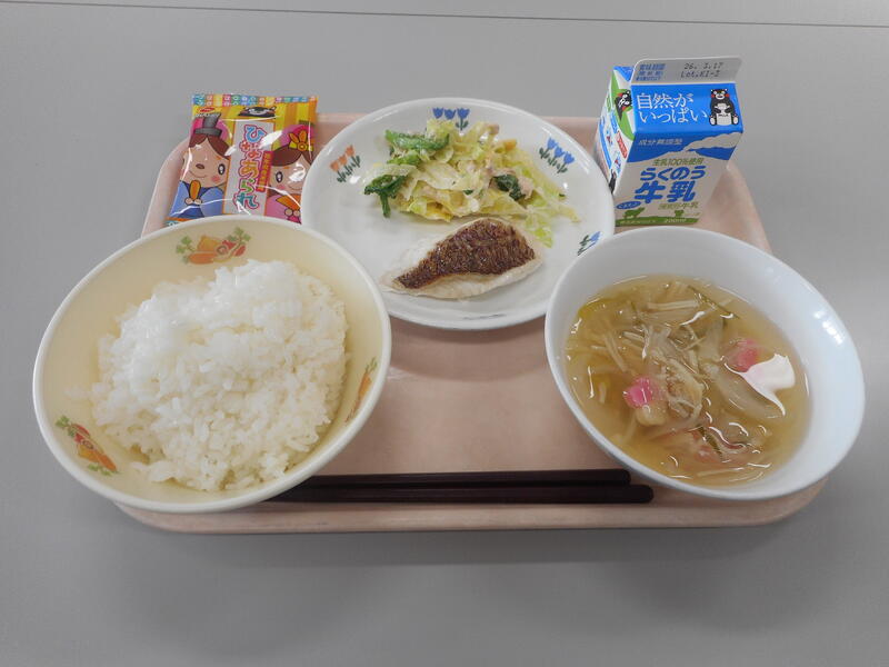 今日の給食のメニューは、【牛乳、白ごはん、はまぐりのすまし汁、鯛の桜塩焼き、菜の花和え、ひなあられ】です。本日は、“ひなまつりメニュー” となっています。いよいよ今週末は卒業式です。3年生にとっては、ひょっとすると多くの人たちにとって、最後の給食1週間となるのでしょうか。“はまぐりのすまし汁” や “鯛の桜塩焼き” が給食で出されるとは驚きです。“はまぐりのすまし汁” は、はまぐりからよい出汁が出ていて美味しかったです。給食に携わってくださっている先生方の深い愛情をかんじてしまいます。ありがとうございます。どれもとても美味しく、感動ものでした。