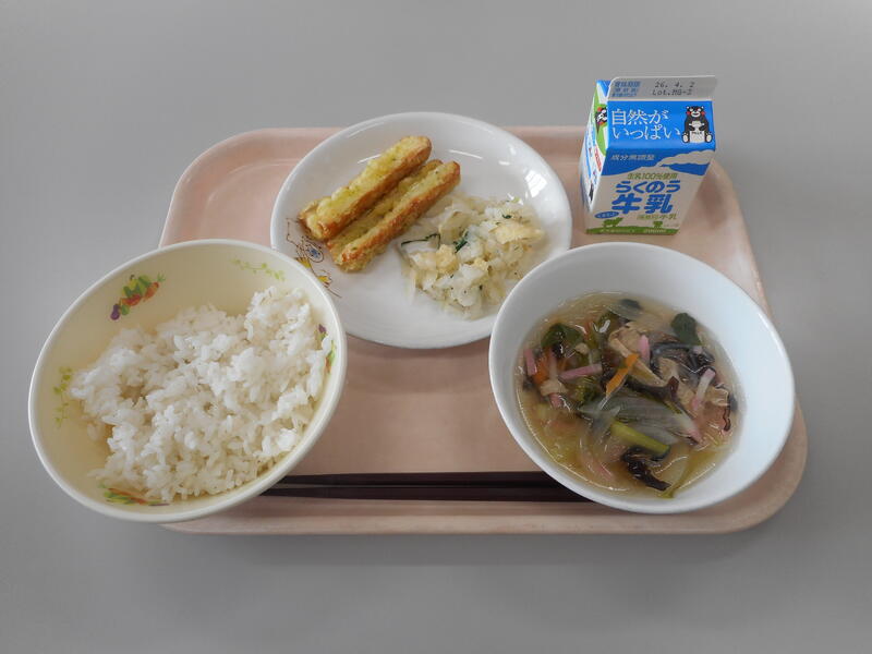 今日の給食のメニューは、【牛乳、麦ごはん、春雨汁、ちくわの磯辺揚げ、南関揚げとしらすのサラダ】です。感想「おいしかった!」です。特に、“ちくわの磯辺揚げ” が個人的に最高でした。ちくわ本来の旨さに加え、磯辺揚げの効果でちくわがさらに美味しくなっていました。ごはんとの相性も抜群で、これだけでどんどんごはんが進みました。また、“南関揚げとしらすのサラダ” は、南関揚げとしらすの組み合わせが抜群でペロッと平らげてしまうほどでした。明日から3連休、そして23日(月)が今年度最後の給食となります。
