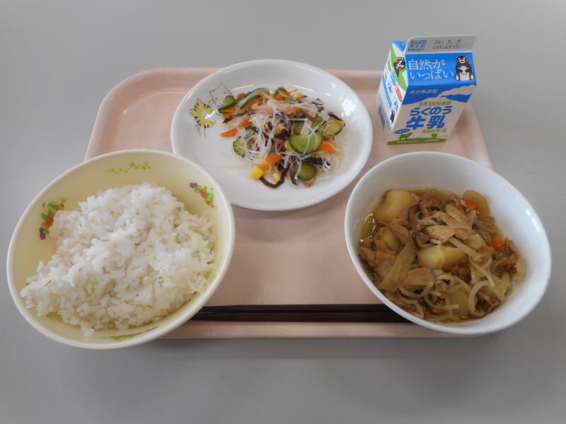 今日の給食のメニューは、【牛乳、麦ごはん、豚肉じゃが、春雨の酢の物】です。“豚肉じゃが” は間違いありません。じゃがいもの美味しさホクホク感は最高でした。豚肉の旨味もじゅうぶん味わえ最高に美味しかったです。また、以前もお伝えしましたが、私は “春雨” が大好きで、この春雨を使った料理は基本的にほぼ全て好きです。中でも、本日のメニューの一つである “春雨の酢の物” は、疲れた身体にピッタリです。何だか身体の内側から元気に健康になったような気がしました。今日も美味しい給食をありがとうございました。