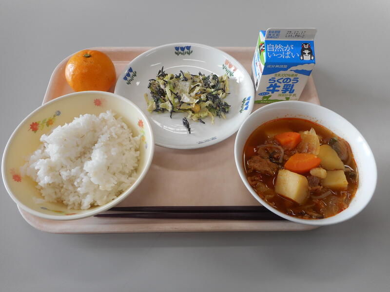 今日の給食のメニューは、【牛乳・麦ごはん・じゃが豚キムチ・ひじきのマヨサラダ・みかん】です。昨日までの暖かさが一転、今日は時間とともに風も強くなり気温も上がらず寒い一日となっています。そんな日に、“じゃが豚キムチ” が登場しました。ゴロッと大きなじゃがいもをはじめ、具材的にはすき焼きのような感じですが、それをキムチが絶妙に絡んでの料理となっており、身体が温まるのはもちろん、食欲もかきたててくれました。また、“ひじきのマヨサラダ” は、野菜の味だけでなく、ひじきの味もフワーッと広がりとても美味しかったです。