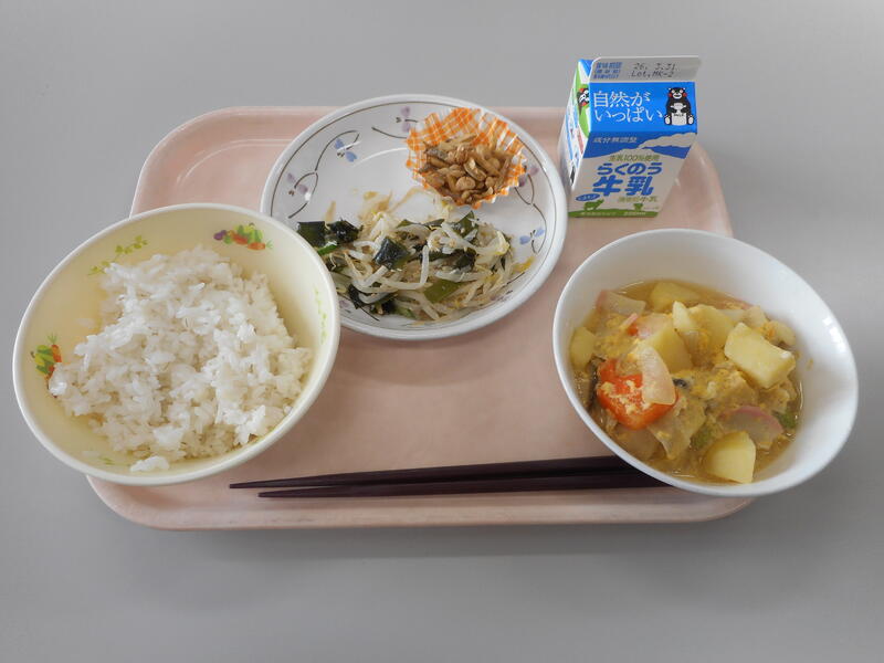 今日の給食のメニューは、【牛乳、白ごはん、高野豆腐の卵とじ、ごま酢和え、ナッツかりんとう】です。まずは、“高野豆腐の卵とじ” です。高野豆腐は大好きな食材で、口に含んだときにジュワーッと出汁が染み出てくるのが大好きです。卵とじとなっていたので、親子丼風にしても美味しく食べられるのではと思いました。また、“ナッツかりんとう” は、甘さもあり、カリカリッとした食感も絶品でした。今日も美味しい給食をありがとうございました。