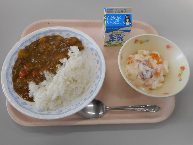 今日の給食のメニューは、【牛乳、和牛カレーライス、フルーツヨーグルト】です。リクエストメニュー第3位のメニューということで、本日は和牛を使用したカレーライス(和牛給食の日)となっています。高森町の “カレーライス” は美味しいです。特に和牛がゴロゴロと入っていて、コクがありとにかく美味しかったです。また、“フルーツヨーグルト” は、大きいイチゴもたくさん入っていて、それらがヨーグルトといい具合にからんでいて大満足でした。今週も美味しい給食ありがとうございました。