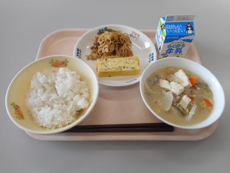 今日の給食のメニューは、【牛乳・麦ごはん・豚汁・千草焼・切干大根の含め煮】です。まずは、“豚汁” です。豚汁は、たくさんの野菜をはじめとした具材が使われていて、それらから出る出汁と生姜の風味が何とも言えず美味しかったです。また、“切干大根の含め煮” は、切干大根の食感と油揚げの旨味がとにかく美味しく大ファンになりました。来週は、恐怖の【人間ドック】が控えている私としては、身体によい給食が毎日とてもありがたい限りです。今週もありがとうございました。