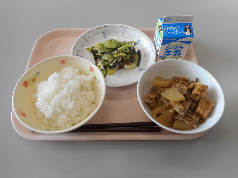 今日の給食のメニューは、【牛乳・白ごはん・大根のべっこう煮・海藻サラダ】です。まずは、“大根のべっこう煮” ですが、一つ一つの具材にしっかりと味が染みており、また、しっかり煮込んであり、ご飯にもとっても合い、最高に美味しかったです。そして、“海藻サラダ” は、海藻をはじめとした野菜がちょうどよい具合に混ざっていて美味しかったです。今年も残り2週間あまりとなってきました。年の瀬を少しずつ感じる今の時期は何だかせわしいですが、個人的には好きな時期です。体調を崩すことなく、新年に向けて、栄養もしっかりとっていきましょう。