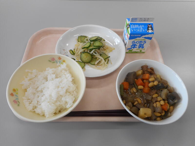 今日の給食のメニューは、【牛乳、麦ごはん、大豆の五目煮、もやしのナムル】です。今日は何といっても、“大豆の五目煮” です。下の写真からも分かるように、大豆をはじめ、じゃがいも・れんこん・ニンジン・鶏肉など豊富な具材が使われています。そして、さらに汁については、昆布のダシがとてもよく出ていて、それが具材にしっかりと染みていることで、大変美味しくお腹いっぱいになりました。また、“もやしのナムル” は、酢が適度にきいていて、『身体にいい』というのが食べながら感じることができました。来週から世間はゴールデンウィークです。部活動に取り組んでいる人たちは、試合等も予定されているのではないでしょうか。しっかりと栄養をとり、最高のコンディションで臨んでください。