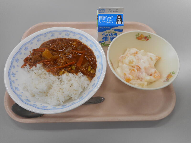 今日の給食のメニューは、【牛乳・セルフぎょうざご飯・お姫さん団子汁・うまかってん】です。まず、メニューを見たときに、“セルフぎょうざご飯?” と?が出てきました。配膳されたものを見てなっとくしました。ぎょうざの中身をご飯にかけて食べるものらしく、これがとても美味しかったです。また、ひんやりした気候の中、お姫さん団子汁は身体も温まって嬉しかったです。