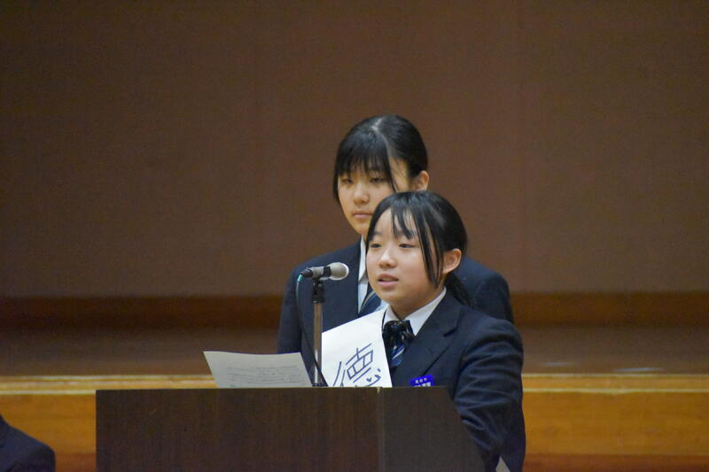 6校時が始まり、職員室にいると、1年1組担任(国語科)の大坪先生が、「校長先生、1年生合同で習字をしていますが、みんな上手ですよ。」と話をしに来られました。早速、2階多目的室に向かうと、静まりかえった教室で、黙々と毛筆の練習をしている1年生。『確かに、上手!!』