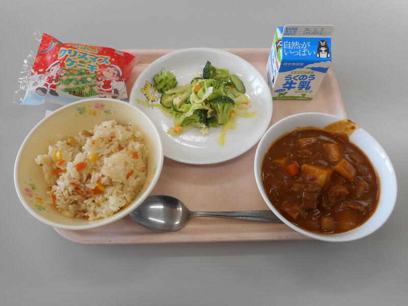今日の給食のメニューは、【牛乳・ピラフ・ビーフシチュー・もみの木サラダ・クリスマスケーキ】です。メニューからも分かるように、今日は “和牛&クリスマス給食” となっています。写真からも分かるように、見た目からも美味しさが伝わってくると思います。まずは、“ビーフシチュー” ですが、全体的な味は言うまでもありませんが、やはり “和牛” は美味しいですね。噛むごとに肉の旨味を味わうことができました。次に、“もみの木サラダ” ですが、よ~く見ると、小さな星形のチーズが使われており、細かい気配りが嬉しくなりました。そして、“ピラフ” です。こちらも美味しかったです。最後にケーキもあるなど大満足の給食でした。今年の給食も残り2回となりました。