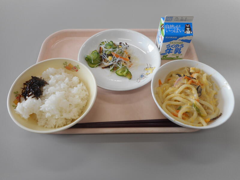 今日の給食のメニューは、【牛乳、白ごはん、親子うどん、春雨の酢の物、しそ昆布】です。“親子うどん” は、親子というだけあり、玉子と鶏肉が使われていることで、温かさも十分でボリュームもありとても美味しかったです。また、“春雨の酢の物” は、春雨の食感が大好きで、酢も効いており疲れた身体にとても優しい味でした。また、“しそ昆布” は、白ご飯といっしょに食べるとさらに美味しく、自分でブレーキをかけないとどれだけでも食べれそうな勢いでした。
