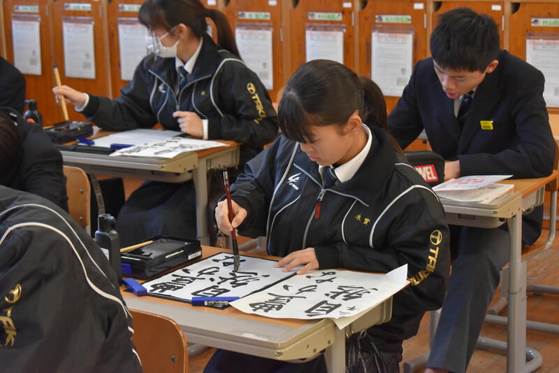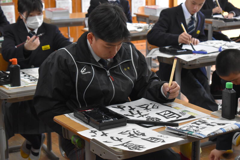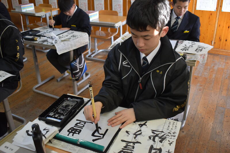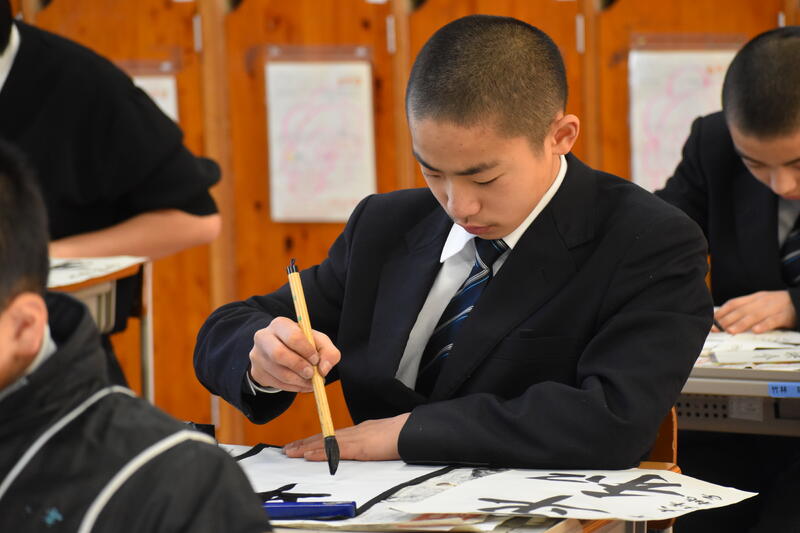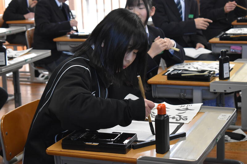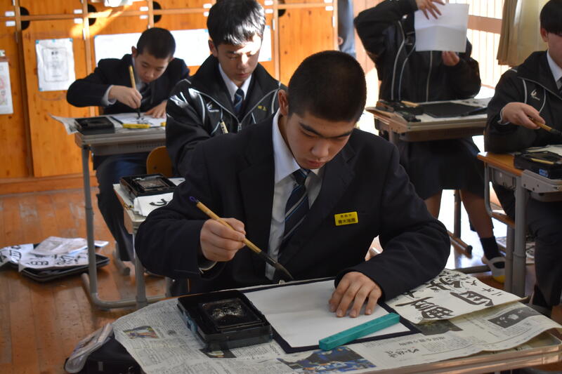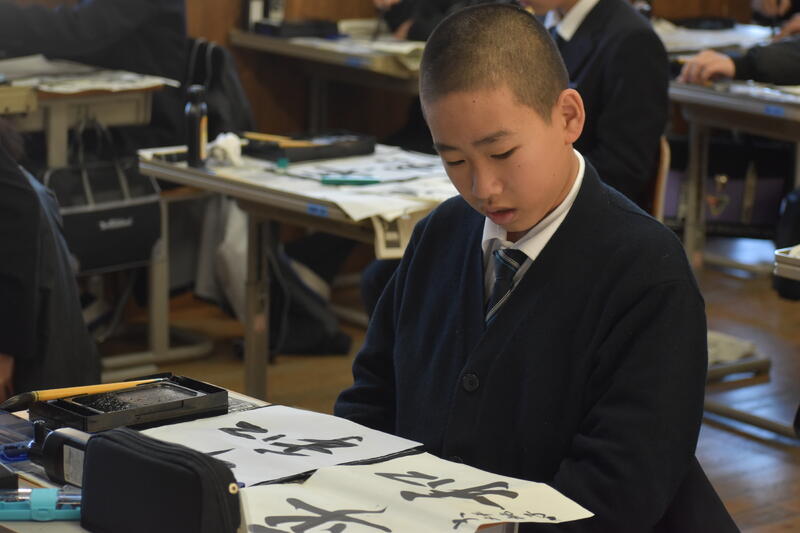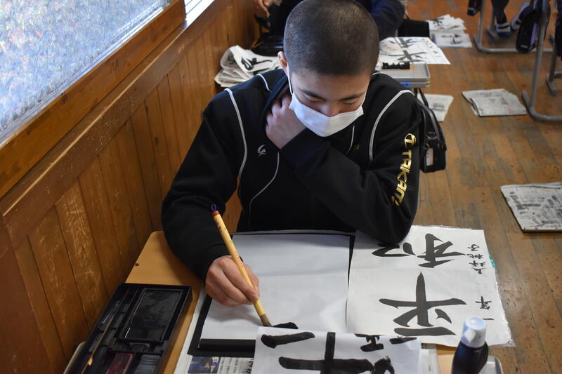 本日の5~6校時に “校内書き初め大会” を行いました。約1時間半、集中して毛筆に取り組む様子は、ある意味圧巻でした。ちなみに、1年生は『平和』、2年生は『豊かな自然』、3年生は『栄光の架け橋』でした。みんな上手!