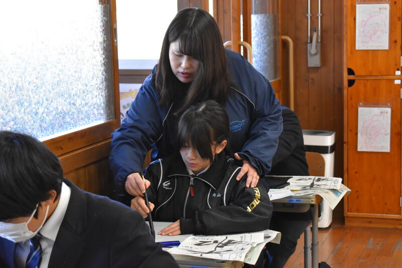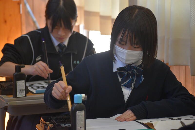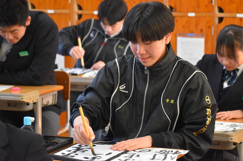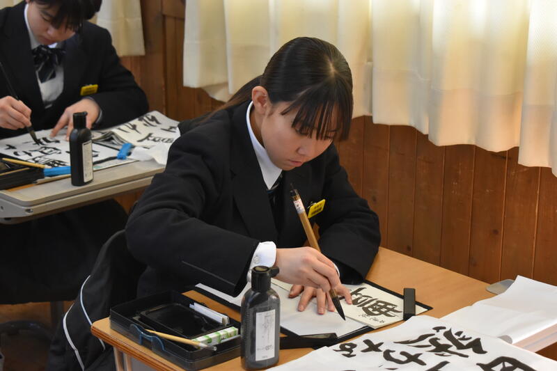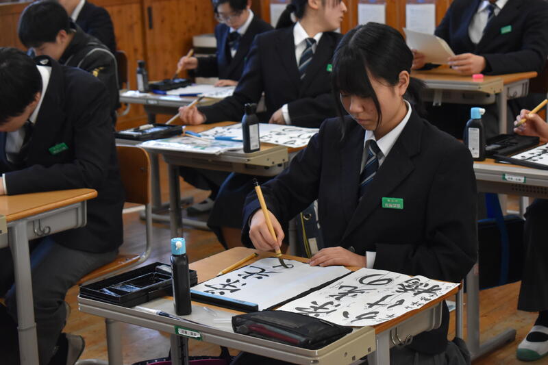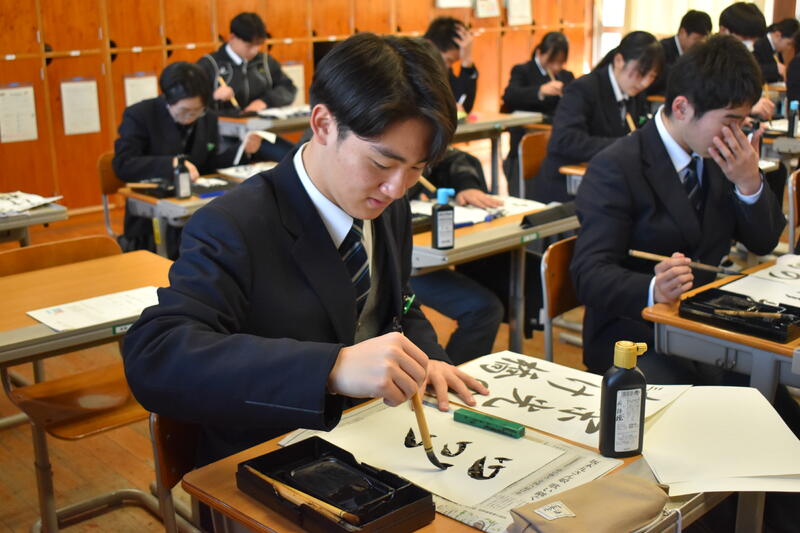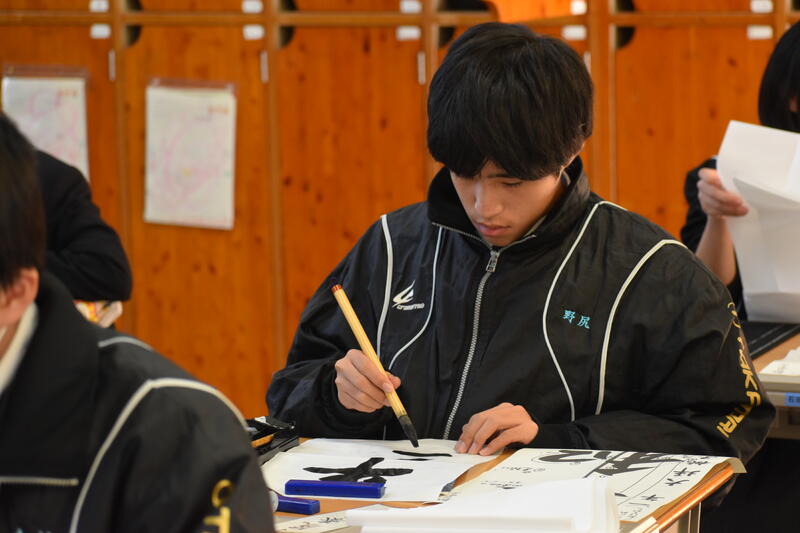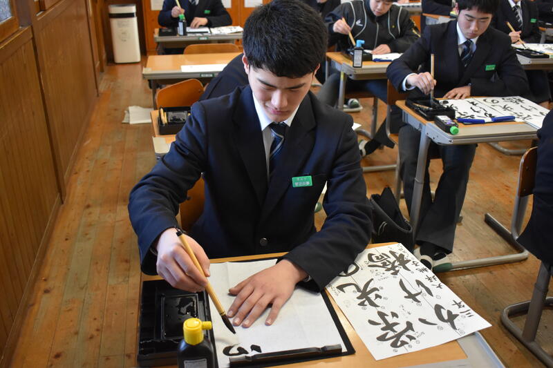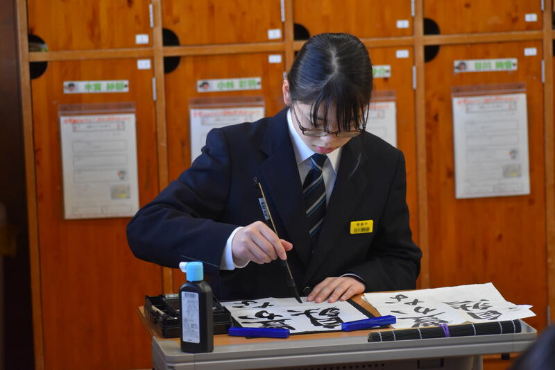 本日の5~6校時に “校内書き初め大会” を行いました。約1時間半、集中して毛筆に取り組む様子は、ある意味圧巻でした。ちなみに、1年生は『平和』、2年生は『豊かな自然』、3年生は『栄光の架け橋』でした。みんな上手!
